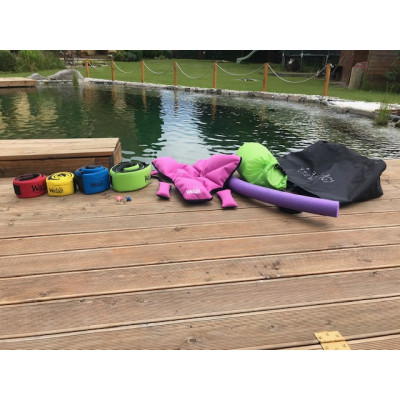 The set includes a set of floats (4 sizes), an orange float (size XS), a plastic and metal nose clip, a large lightening pillow, a small lightening pillow (Kranio), a smaller fabric noodle (M), a larger fabric noodle (L), and a large waterproof bag.